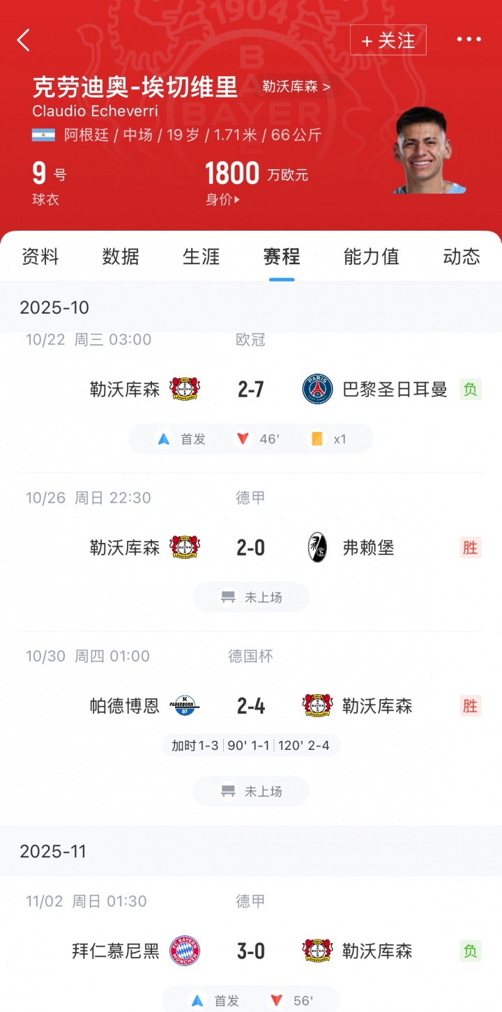 2025-11-02 16:13:19踢强队才让上?19岁埃切维里对阵巴黎拜仁都首发,药厂2场丢10球